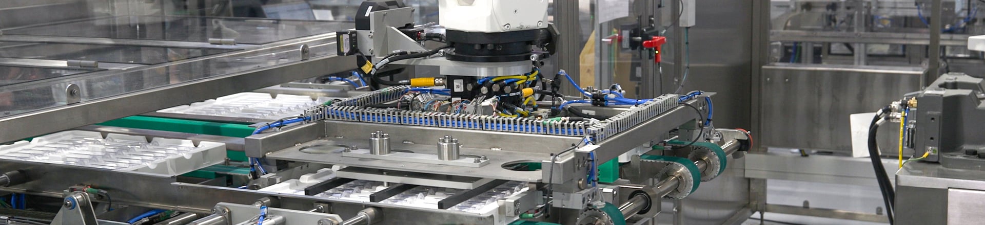 Palettiseurs et dépalettiseurs robotisés permettent d’automatiser la distribution des composants conditionnés en plateaux thermoformés. Notamment, des produits fragiles ou d’aspect comme stylo injecteur d’insuline, bouchon de parfum, rouge à lèvres etc.